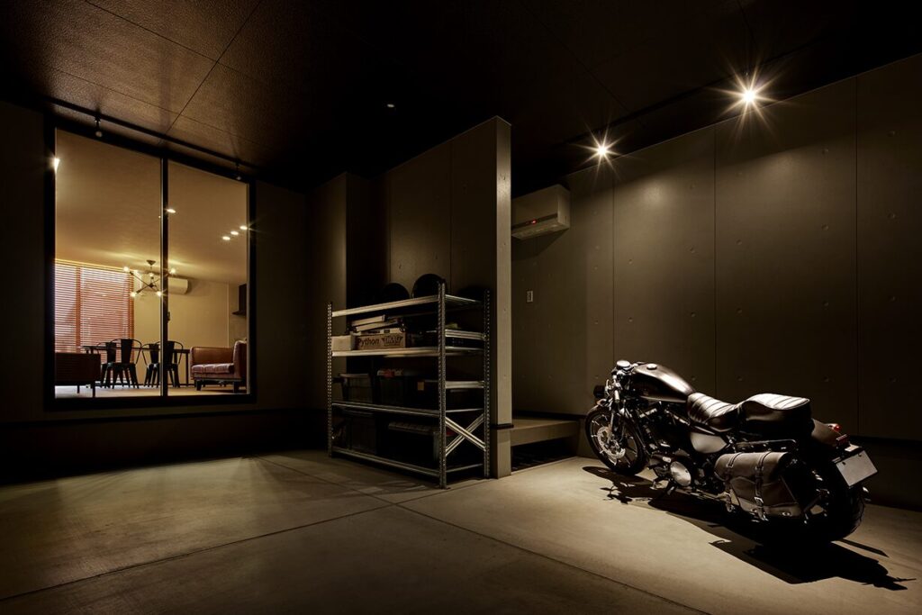 ガレージはバイク愛好家のための専用空間として設計され、室内から愛車を眺められる贅沢な仕様に。