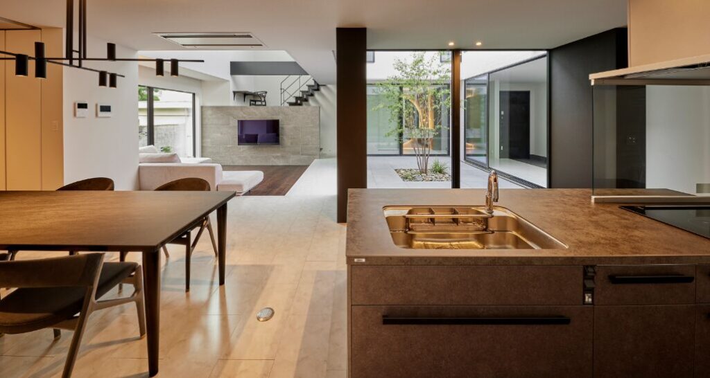 室内の床材や色味を中庭と統一すると、より洗練された印象になります。