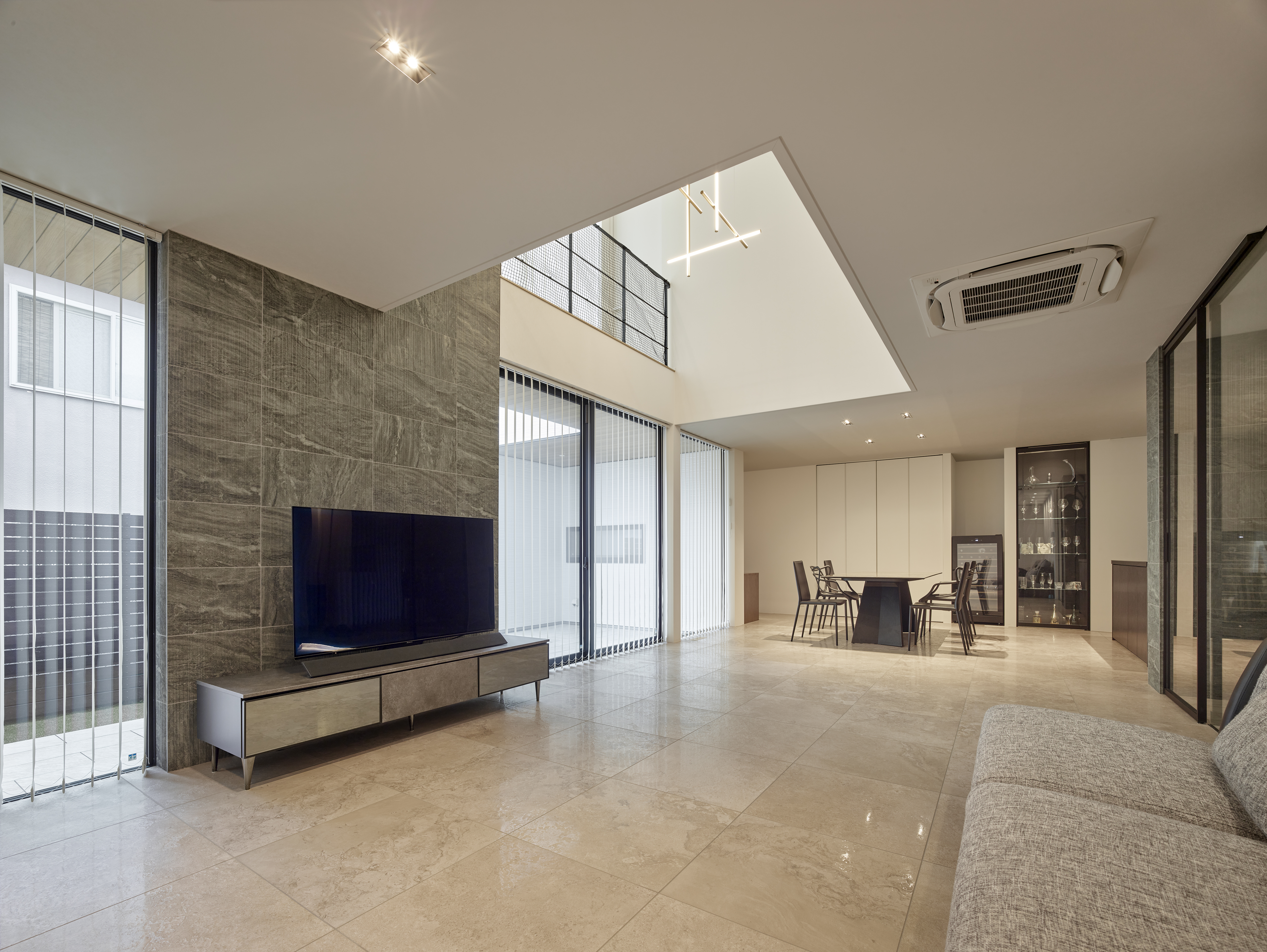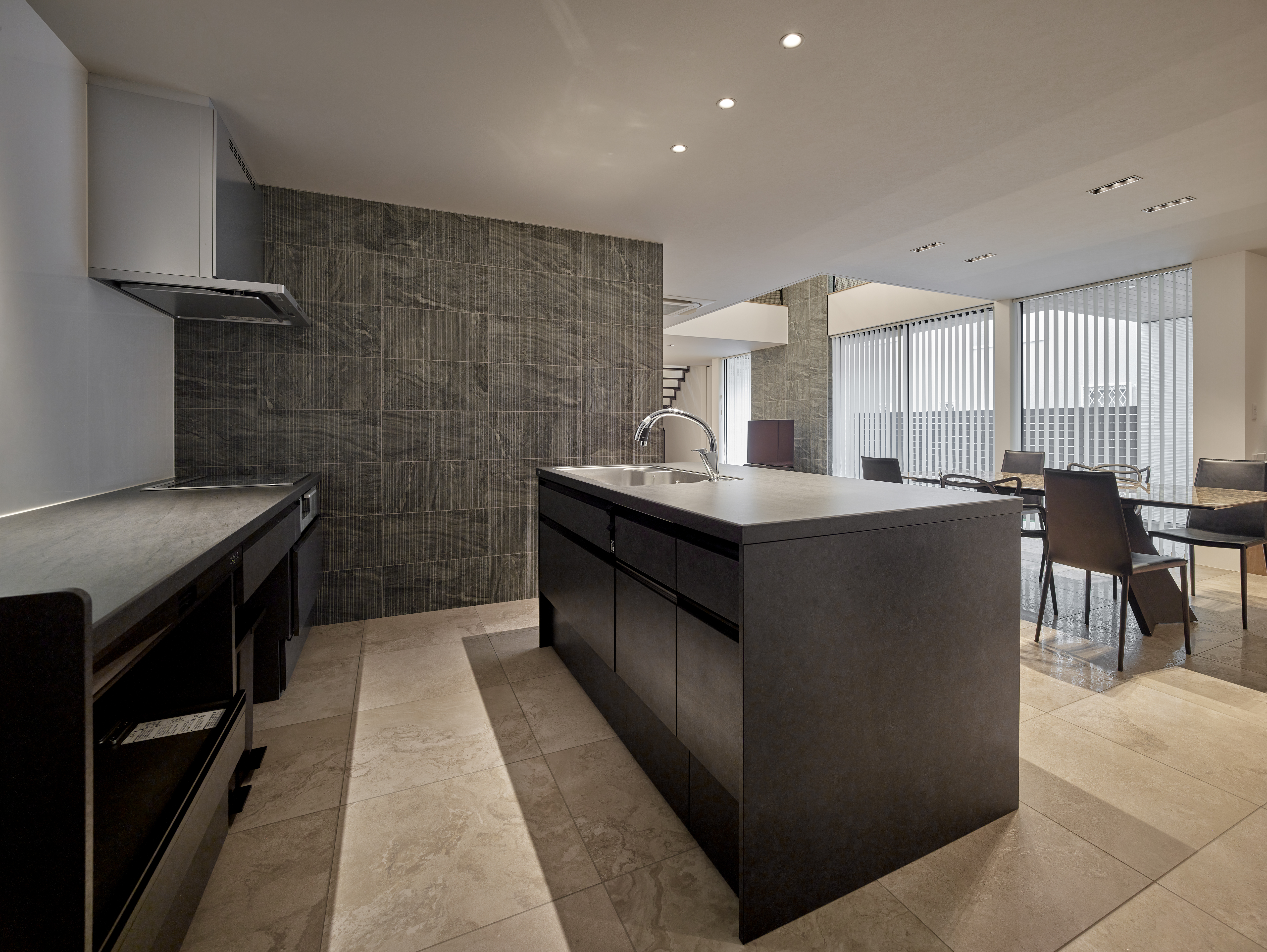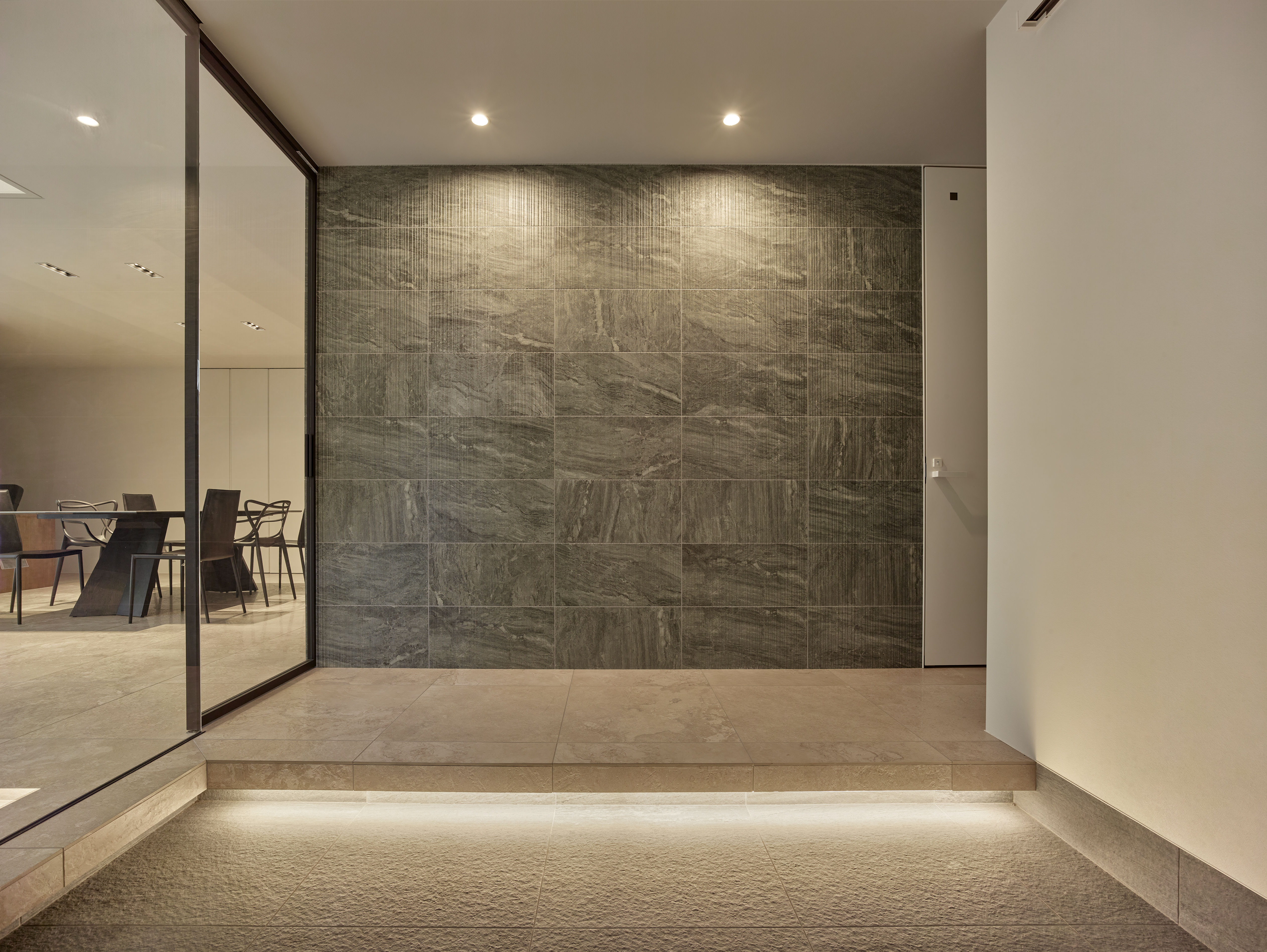 ■ 光を漉す縦格子:ブラインドが生む光と影のストライプが、床に美しい紋様を描く。 ■ 透明な結界:ガラス越しに広がる、連続性と独立性が共存する奥行きのある空間。 ■ 静寂の鏡面:石壁と対峙する艶やかな床が、空間の広がりを倍増させる。