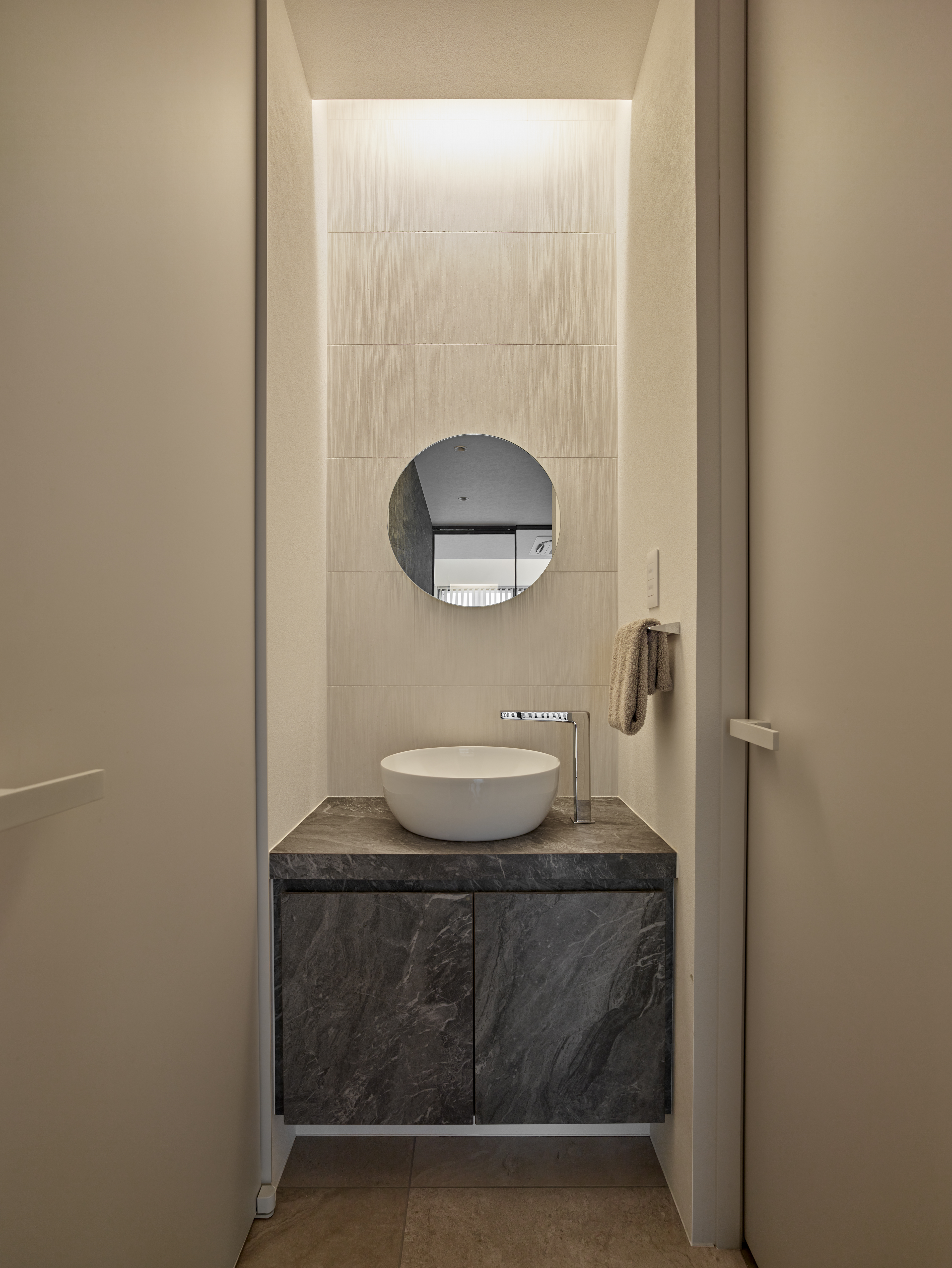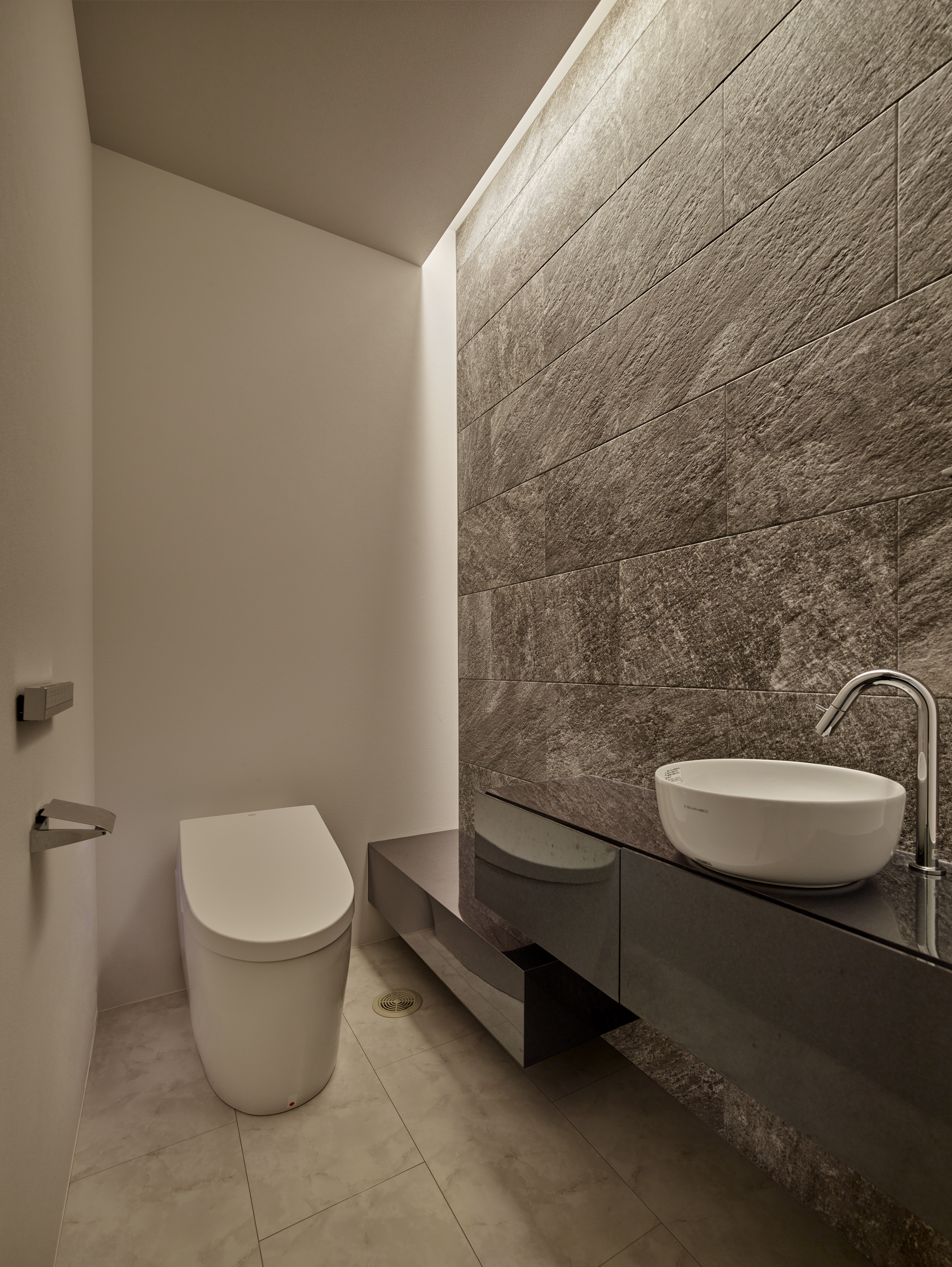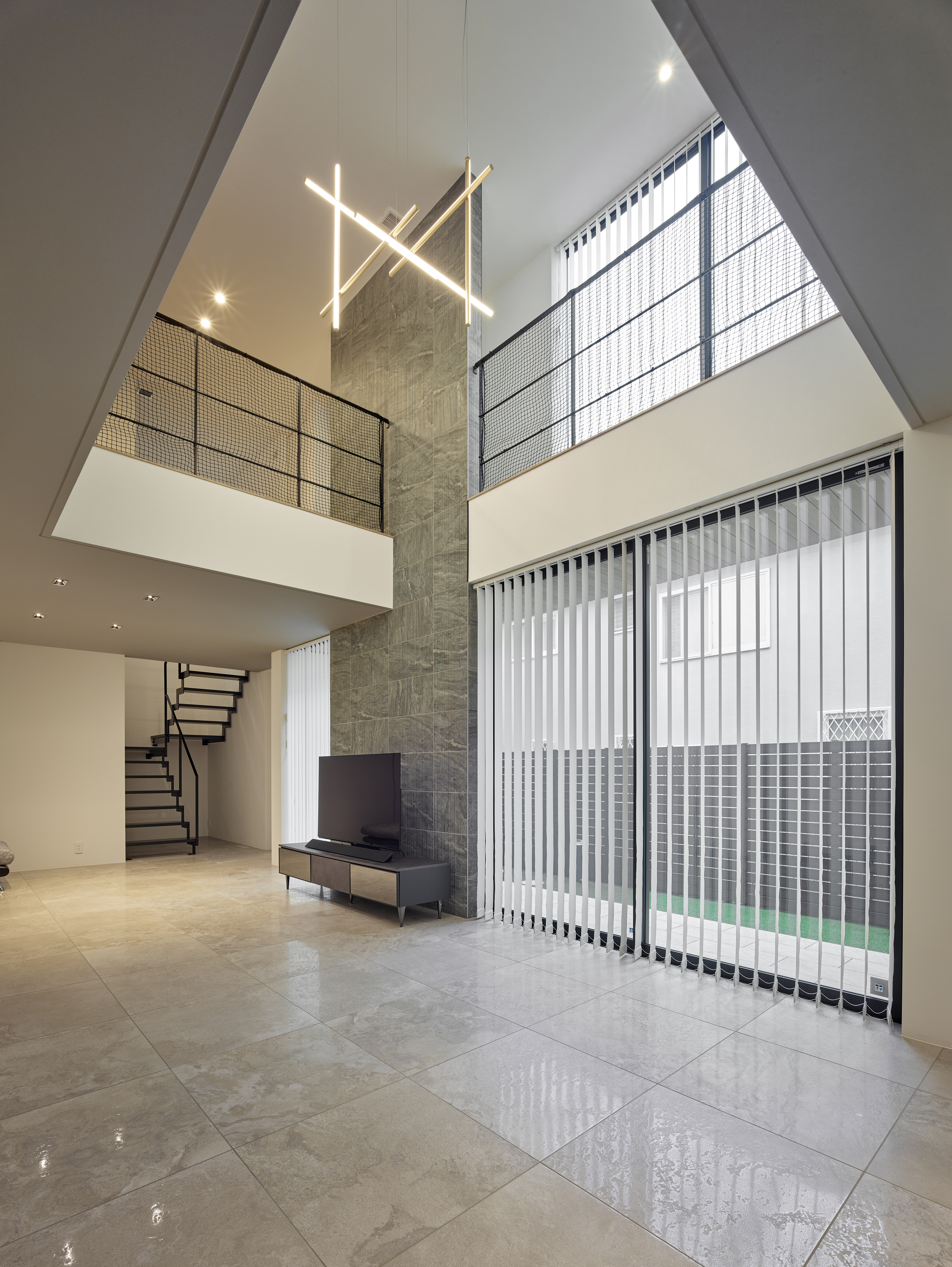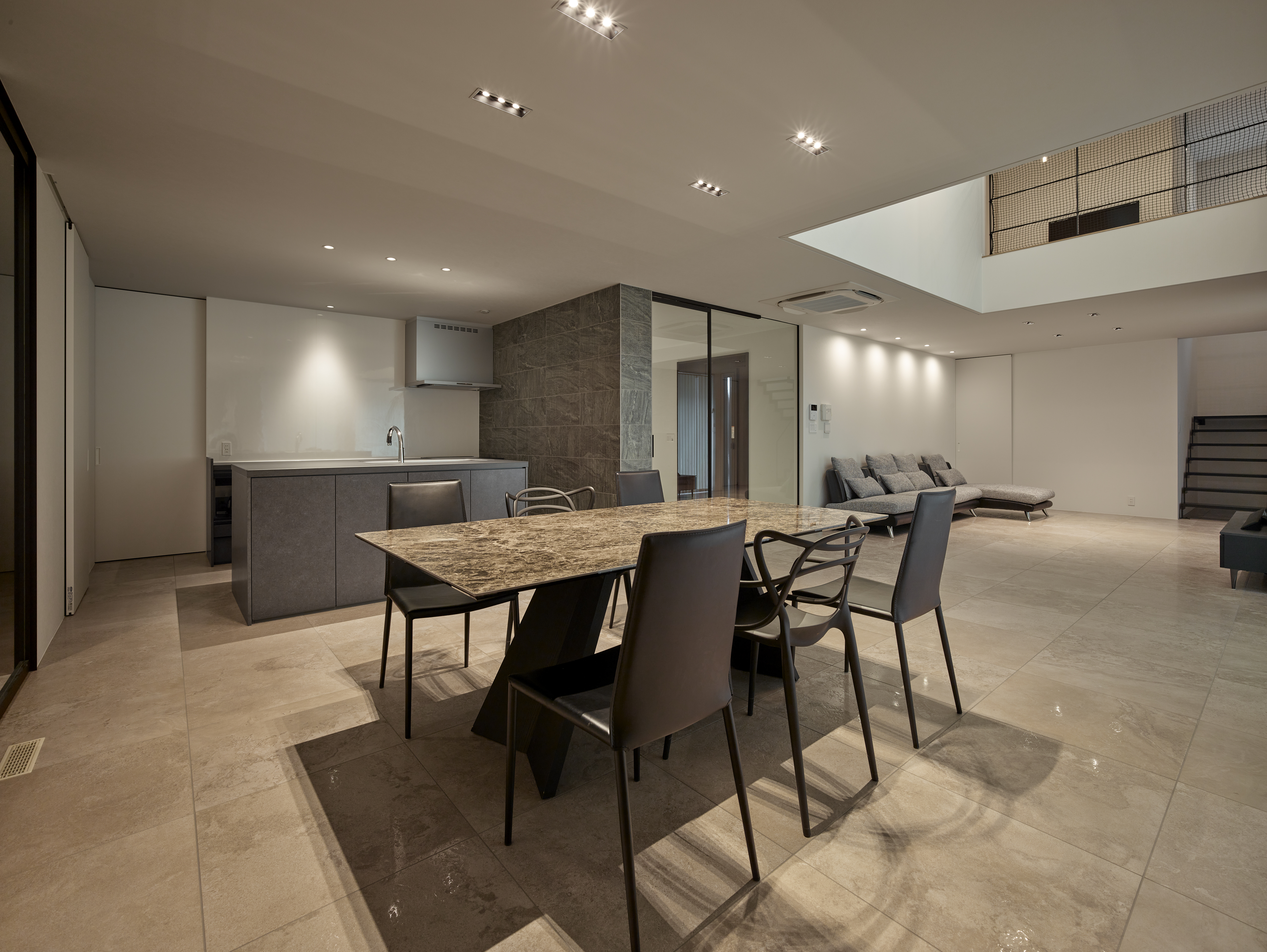 ■ 光を漉す縦格子:ブラインドが生む光と影のストライプが、床に美しい紋様を描く。 ■ 透明な結界:ガラス越しに広がる、連続性と独立性が共存する奥行きのある空間。 ■ 静寂の鏡面:石壁と対峙する艶やかな床が、空間の広がりを倍増させる。